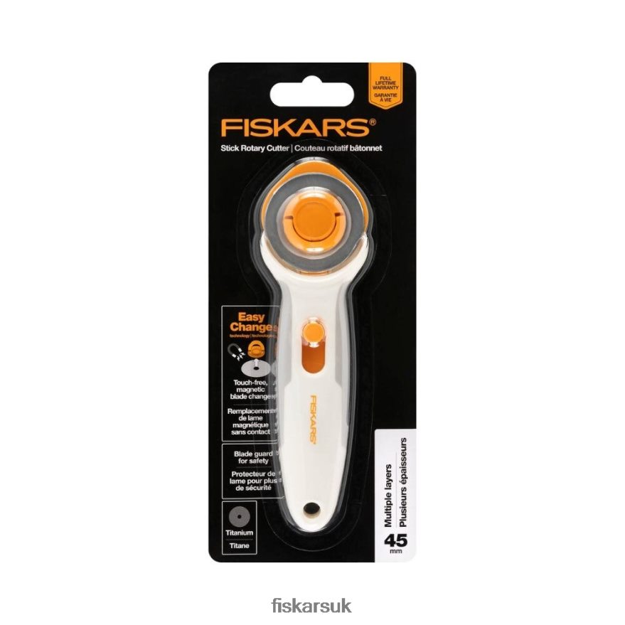 - Fiskars Easy Change Titanium Stick Rotary Cutter (45 mm) features a magnetic blade hub system for safer, easier and quicker blade replacement