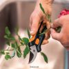 Smaller than a traditional pruner, but with more cutting capacity than a snip, Fiskars Floral Pruner is ideal for working with cut flowers, as well as tasks essential to encouraging healthy growth, such as cutting, light pruning and deadheading. Featuring a small bypass pruner blade design with a cut capacity up to 1/2 in., this pruner has fully hardened, precision-ground, steel blades that stay sharp through heavy use – great for pruning florals and green growth like roses or berry bushes. A low-friction coating helps the blade glide through cuts, preventing it from gumming up with sap and debris, and helping it resist rust. Ideal for cut flowers or making floral arrangements, additional features include a stem stripper for removing leaves or thorns on various-sized stems, as well as a built-in wire cutter. An Easy Action(TM) spring gently opens the blades after each cut to help reduce hand fatigue, while Softgrip touchpoints enhance comfort and control. An easy-open lock protects the blade when not in use.
